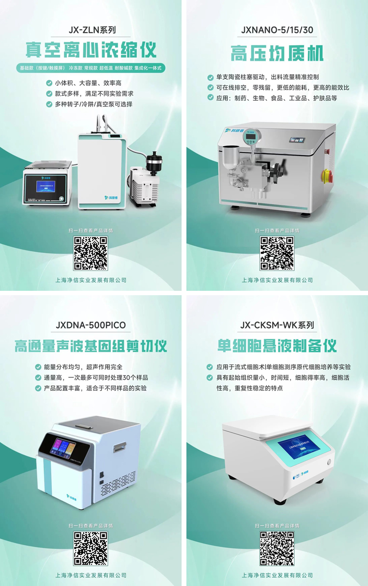 十幾年來凈信不斷進行自我創(chuàng)新與突破。通過持續(xù)優(yōu)化產品性能和提升服務質量,我們實現(xiàn)了從單一產品到多元化發(fā)展的轉變,拓展了市場影響力。上海凈信科研者系列產品也在上市推廣中!真空離心濃縮儀、高壓均質機、單細胞懸液儀、高通量聲波基因組剪切儀。