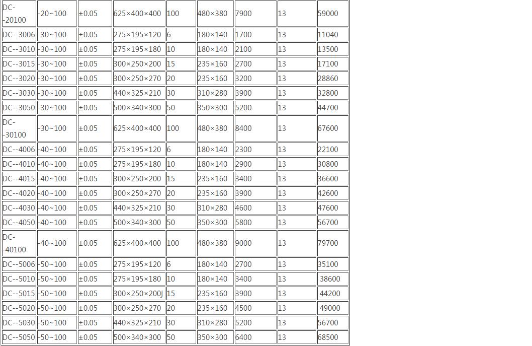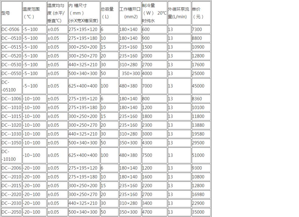 DC低溫恒溫槽系列型號與參數(shù)對照表